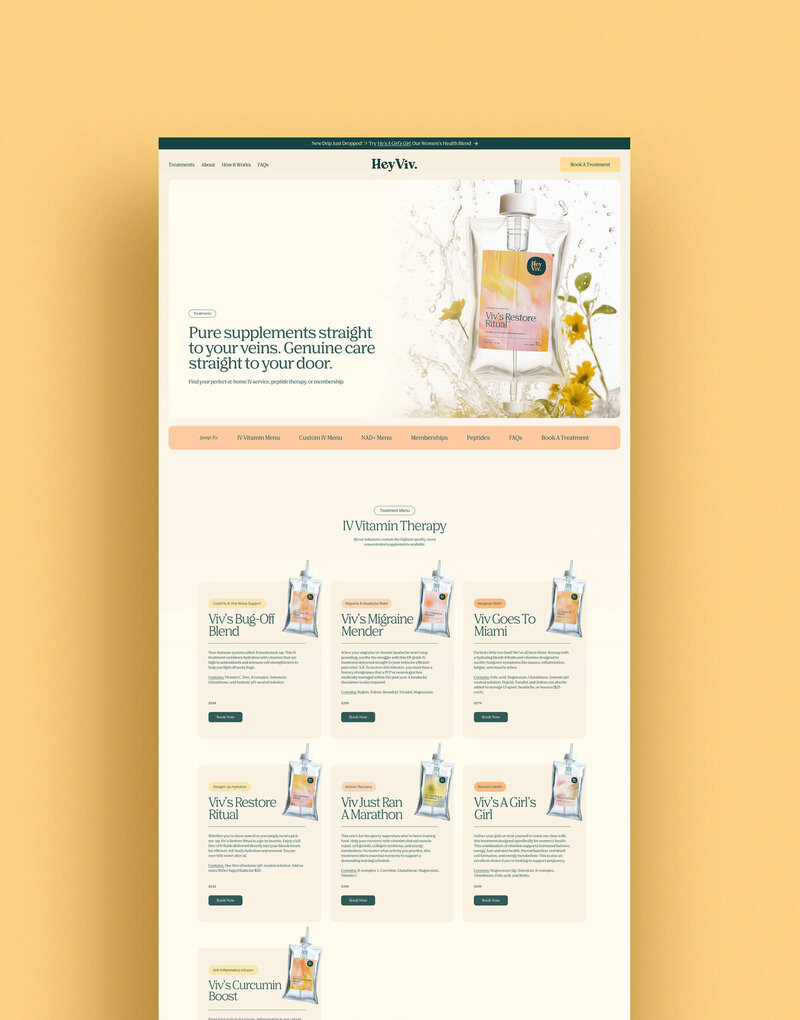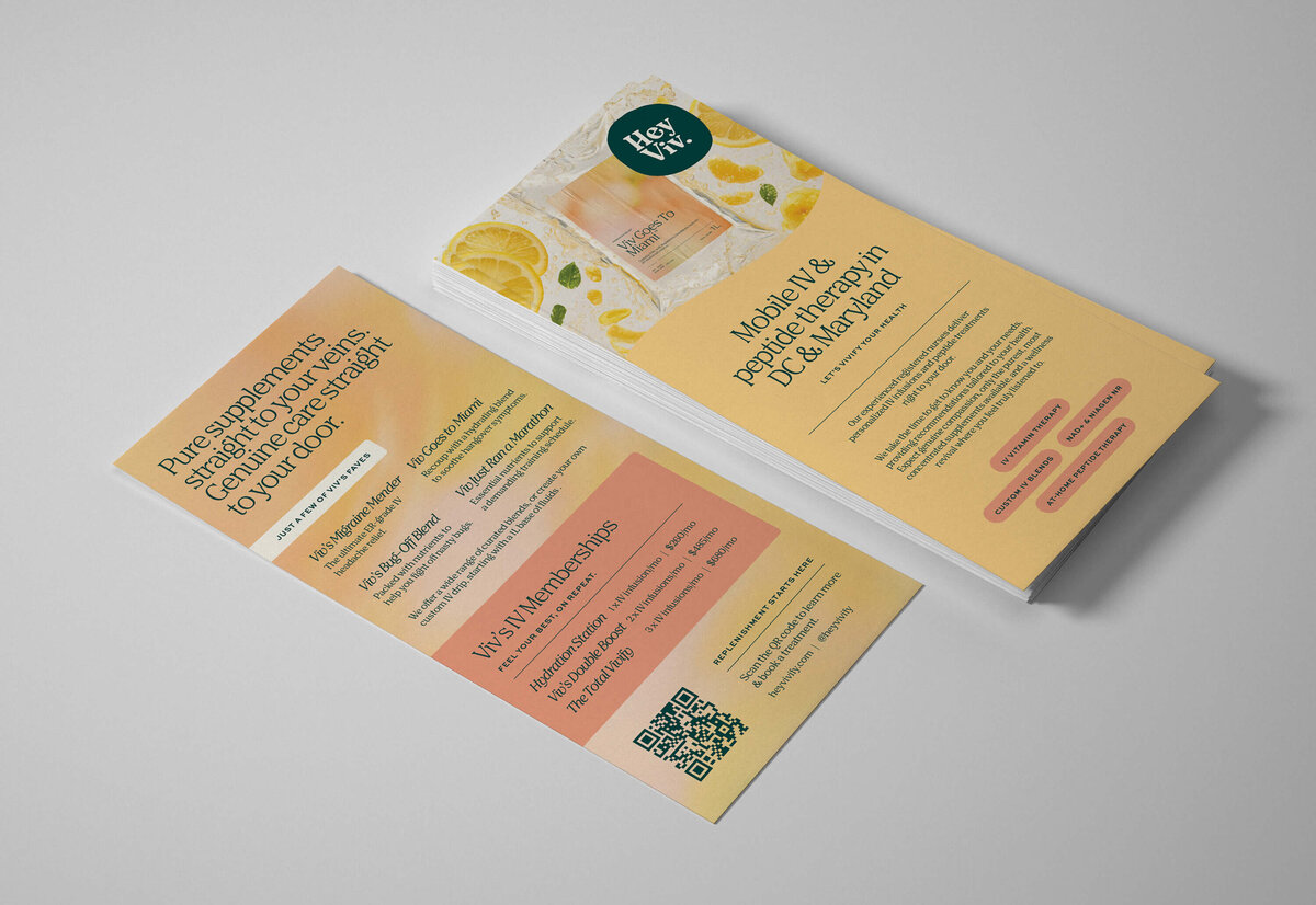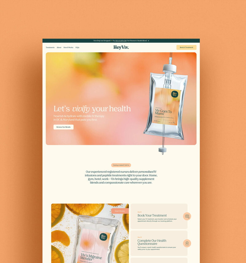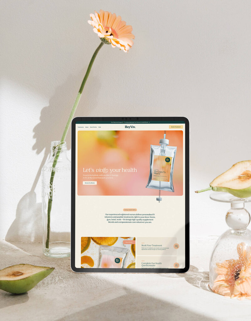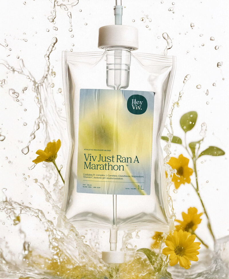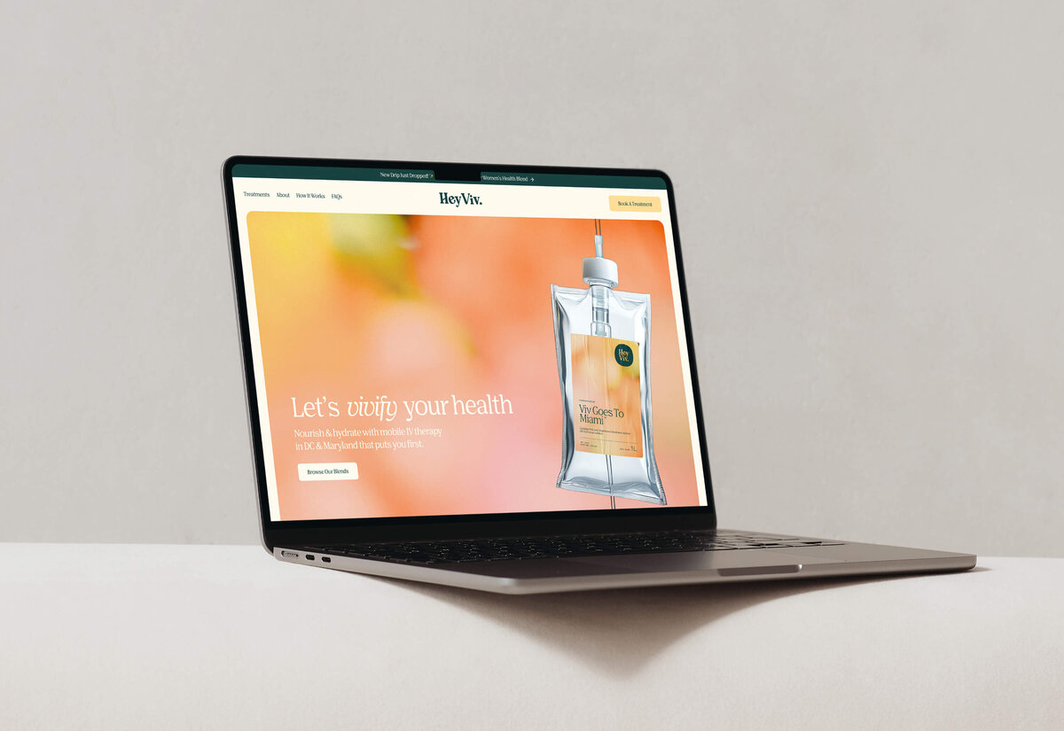 Hey Viv is a Washington, DC–based mobile IV therapy brand bringing preventative health, hydration, and recovery treatments directly to clients. The founders wanted a brand identity that felt approachable, modern, and friendly — one that could stand apart from the overly clinical, blue-dominated aesthetics common in the wellness space.
