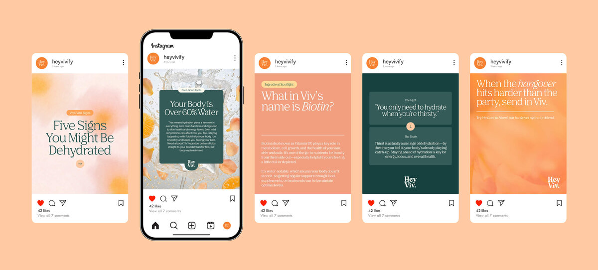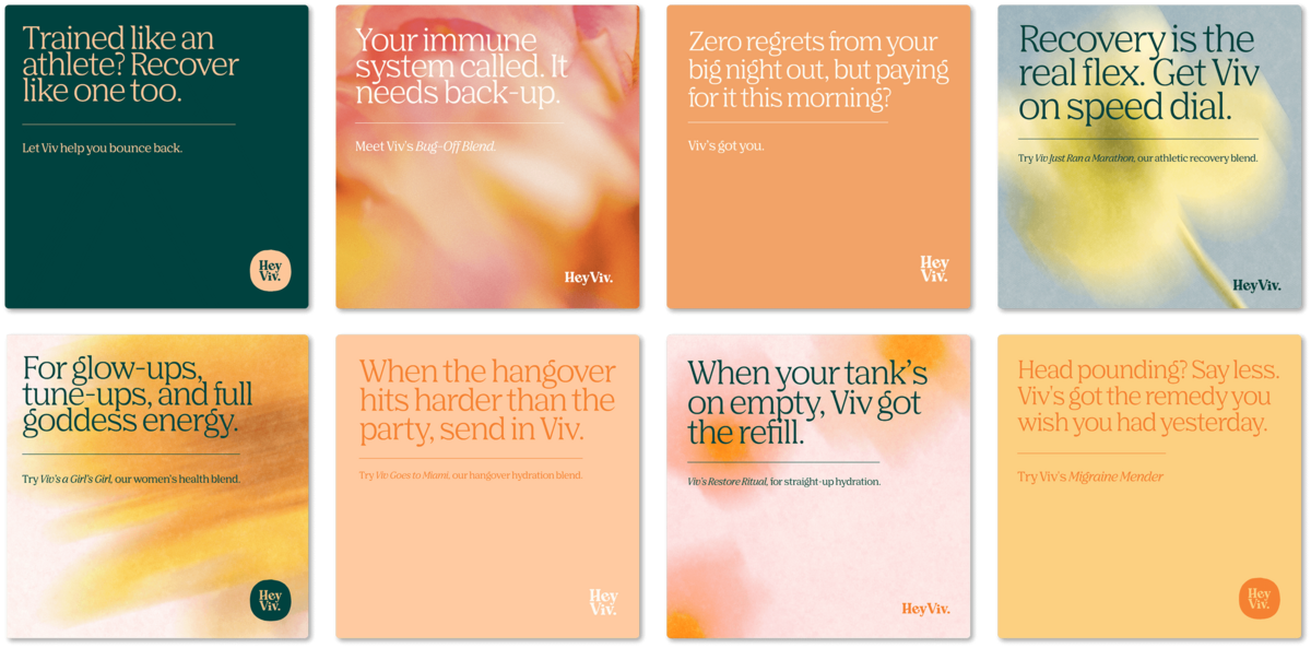 The result is a brand identity that feels fresh, confident and approachable, positioning Hey Viv as a distinctive voice in preventative health and mobile IV therapy. It reflects the brand’s commitment to making care easy, stylish and restorative — a high-touch service with a personal feel.