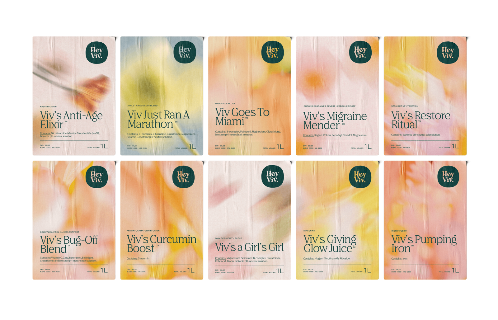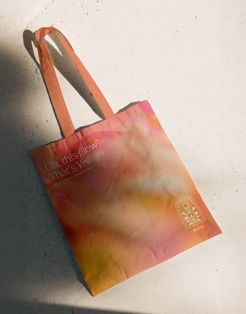 Alongside these hero visuals, we designed custom sticker labels for each of Hey Viv’s IV blends. Each label carries its own personality while fitting cohesively within the broader system, allowing the product range to feel distinctive, flexible, and easily recognisable. To round out the brand experience, we extended the design to a range of collateral including business cards, a tuck top box, tote bag and flyer — each piece reinforcing the identity through consistent use of colour, type and texture.