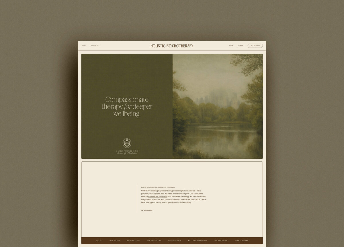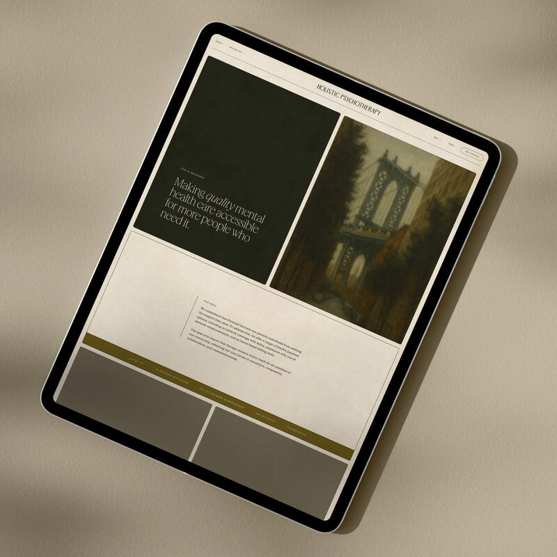 Holistic Psychotherapy NYC is a New York–based practice offering thoughtful, integrative care for individuals seeking balance, healing, and deeper connection. The brief for this project was to create a brand identity that embodied stillness, subtle elegance, and quiet luxury — an aesthetic that feels both grounded and refined. The client wanted something timeless and authentic, a brand that could honour the depth of psychotherapy while appealing to discerning, wellness-focused clients in the city.